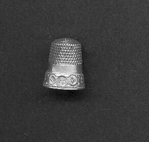 Small silver thimble with decorated band at rim. Design of wheel with spokes and dots around each wheel. Plain narrow band above then knurling to and over top. Sterling and 4 stamped on plain band. Simon Bros. logo in apex.