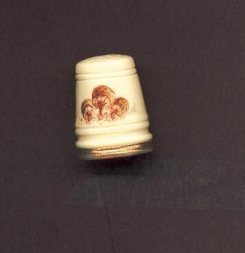 Cream coloured bisque pottery thimble. Hand painted - gold band at rim, cluster of mushrooms, brown, one side, single mushroom other side. Artist Mary Ann McGee, Vancouver, B.C. signed.