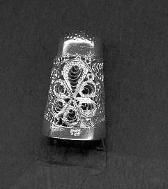 Tall silver filagree thumble. Stamped 925 0n plain band at rim. Main body of thimble is filagree work with a plain band at top. Knurling over top. Label with thimble says ÒCottage Product Handmade in the PhilippinesÓ