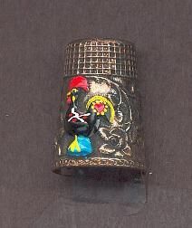 Tall brass thimble, side seamed, separate top, gold washed inside. Narrow snake and dot rim. Wide embossed band of flowers and leaves with a raised Portugese good luck Barcelos Cock enamelled in bright colours in the center. Waffle knurling above band to top. Top is off center, round indentations with a center mark.
