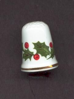 White slightly fluted thimble with gold band around rim. Decal decoration of green holly leaves and red berries around thimble. Stamped inside ÒQueens Fine Bone China Made ,in EnglandÓ