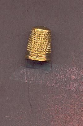 Small sterling silver thimble with rolled rim. Narrow band of wave scroll (snail) pattern above rim.Wider plain band above stamped with ÒSterling 7 *Ó. Knurling to and over top.