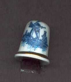 White china thimble, fluted with gold band around rim.Blue windmill scene Decal. No marks.