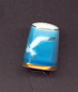 Porc elain, blue,white and gold thimble. Wide gold band at rim/ Body is in shades of blue with a white gull with gold tipped wings, feet and beak. Top of thimble is unglazed, body glazed.Stamped inside with logo of Bing & Grondahl , a number 4801 and Made in Denmark.