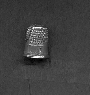 Brass, thimble with rolled edge. Contains mostly zinc as the brass colour is barely visible. Narrow band of vertical lines above rim then a wide plain band. Size Ò6Ó stamped on band. Knurling from here to and over top.