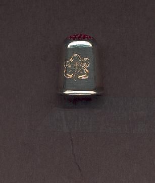 Sterling thimble with rolled rim. Red stone in top.Sides plain - no knurling and only a single 5 petalled flower (dogwood) on side. H.J. Sterling 5 stamped in apex.