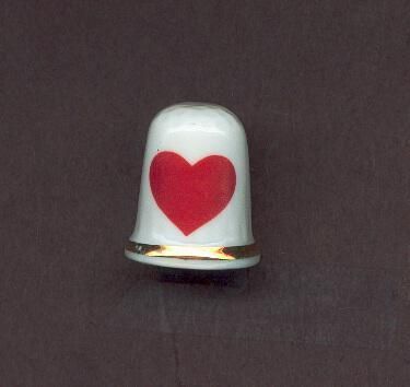 Porcelain thimble, white glaze, slightly fluted with gold band at rim. Decal of 2 red hearts. Stamped Japan inside.