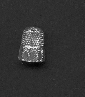 Silver ten panelled thimble. Each panel has a diamond pattern. Knurling from the wide band to and over top. Simon Bros. logo in apex. Sterling 7 stamped in one panel. Called Octagonal (?) Oval panel Cat. #104