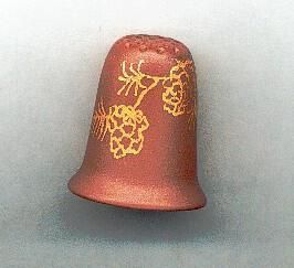 Brown matte finish slightly fluted ceramic thimble. Hand painted with pine cone sprays in gold around thimble. Top has indentations. Signed in gold on outside M.Kohls. In side thimble MK311.