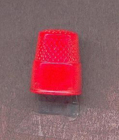 Plastic thimble, dark red in colour,slight sign of rim. Wide plain band - 1/2thimble .Knurling from band to and over top Threads inside lower half of thimble. No marks.