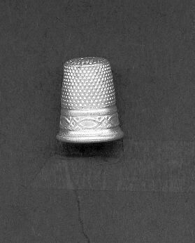 Aluminum thimble with rolled vertically lined rim. 2 rows of vertical ribbing with a plain narrow row between just above rim, then a wide band of pattern above. Pattern looks like a row of ovals with a triangle between. No marks. Knurling from pattern to top and over. Hole, small in pattern row.