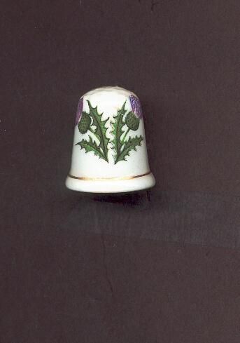White glazed thimble,slightly fluted with fine gold line near rim. Screen printed design of 2 purple thistles with green leaves. Inside in black writing ÒEnglish Fine ChinaÓ No other marks.