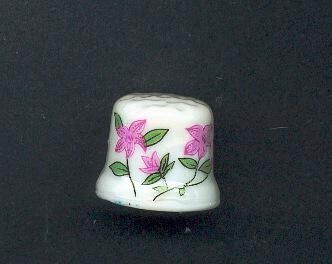 White glazed china thimble, squat shape thimble with knurling on top. Decal of pink flowers, green leaves.