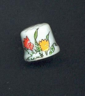 Whie glazed china thimble, squat shape, with knurling over top. Decal of yellow-orange flowers and green leaves. Crude.