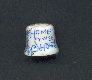 White china thimble, glazed with knurling on top. Squat shape. Crudely made. ÒHome Sweet HomeÓ in blue with spray of leaves and flowers both sides.,