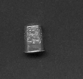 Sterling silver hand crafted thimble. Fine rolled rope rim added. Wide plain band above then a stylized all-over design of leaves and daisy - like flowers. Side seamed, separate top also with design.Stamped Sterling inside -also initials TJL (maker) and 5 and handmade,