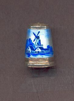 Silver thimble with narrow raised rim. Two narrow bands of vertical lines with plain indented band between. Blue enamelled scene of buildings, windmill and trees/. Top has Gabler Bros. logo with IZ in center which means made for export./ Stamped 935 in ribbed band.