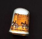 Bone china thimble, White glazed thimble with knurling on top. Commemorative. Beige, brown, yellow scene of palace, building - Buckingham,chariot, 3 horses with riders. Below the words Ò25th Anniversary of the Coronation 1953-1978. Gold band at rim. Inside stamped Caverswall, England.