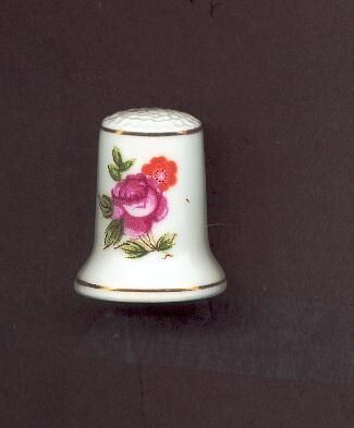 White china thimble, tall, fluted with fine gold lines at top and rim. Two floral sprays either side, roses and green leaves. Stamped Japan inside. Paper label also inside reads ÒFine ChinaÓ.Decal.