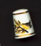 White bone china thimble with gold bands top and rim. Hand painted yellow breasted bird on bough with leaves. On rear, small boiugh with leaf and artists signature ÒP. Dunkley.Ó Royal Worcester logo with Fine Bone China and England inside thimble Knurling on top.