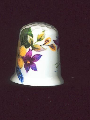 White bone china very large thimble with rounded top and fluted base. Knurling on top. Two screen pinted sprays of yellow and purple flowers with green leaves around thimble. Stamped inside with logo of ÒSanford Fine Bone China Made in EnglandÓ with laurel leaves and crown.