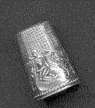 Silver thimble, tall, with narrow band of beads at rim. Side seamed. Wide band - over half of thimble - with Den Lille Havfrue (The Little MermaidÓ ) on a rock and leaves around. Square knurling to top. Round knurling on top with double triangle mark with 925 (sterling quality) .