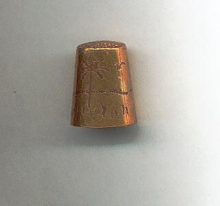 Brass thimble, hand etched. Desert scene of palm trees, cacti, sun, birds. Square knurling on top.