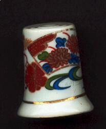 Glazed white china tall thimble, large, fluted at rim. Indented circles on top instead of knurling. Oriental design - decal - of mums,, leaves, and oriental symbols in red, green , blue and gold.