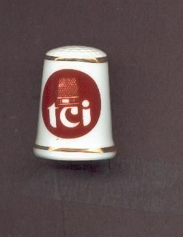 White china thimble with gold bands top and rim. Maroon design of a Thimble over tci (Thimble Collectors International). Blue flower back side of thimble. Stamped inside ÒHand decorated Audre China - Box 6685, 1009 W. Olive, Burbank, Calif.Phone 848-5917Ó.