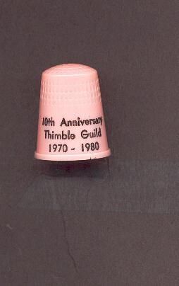 Pink plastic advertising thimble with raised rim. Wide plain band with black lettering advertising Ò10th Anniversary Thimble Guild 1970 - 1980Ó Also a logo - circle with thimble, needle, thread and words Thimble Guild.U.S.A. 19 in apex.
