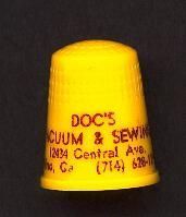 Yellow plastic advertising thimble with raised rim. Wide plain band above with brown or maroon advertising ÒDocÕs Vacuum & Sewing 12434 Central Ave. Chino, Ca (714)628-1294. U.S.A. 4 in apex.
