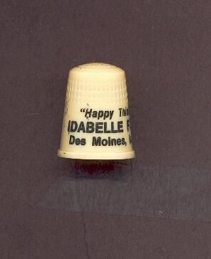 Cream coloured plastic Personal thimble with raised rim. Wide plain band above with black lettering ÒHappy Thimbling Idabelle Forker Des Moines, IA 50310. U.S.A 7 in apex.