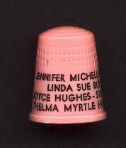 Pink plastic Personal thimble with raised rim. Wide plain band above with ÒJennifer Michelle Buss, Linda Sue Buss, Joyce Hughes-Stephens, Thelma Myrtle HughesÓ U.S.A. 10 in apex.
