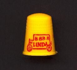Yellow plastic Personal thimble with raised rim. Wide plain band above with Òyou & I BussinÕ around for TCI. Linda Buss 19809 Burbank, CaliforniaÓ and aÓbus outlined with 4 thimble windows, 2 trhimble wheels and Linda Ò on it. U.S.A. 1 in apex.