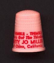 Pink plastic Personal thimble with raised rim. Red printin g on the wide plain band above rim. ÒThimble Thimble WhoÕs Got The Thimble Betty Jo Miller of Chino CaliforniaÓ. U.S.A. 3 in apex.