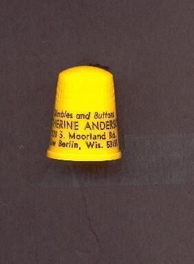 Yellow plastic Personal thimble with raised rim. Wide plain band above with black letterin ÒThimbles and Buttons Catherine Anderson 2530 S. Moorland Rd. New Berlin, Wis.53151Ó U.S.A. 10 in apex.