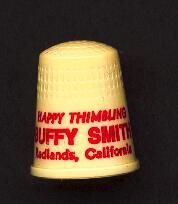 Cream coloured plastic thimble with raised rim. Wide plain band above rim with red lettering. ÒHappy Thimbling Buffy Smith Redlands, CaliflorniaÓ. Also a red heart on the thimble. u.S.A. 16 in apex.