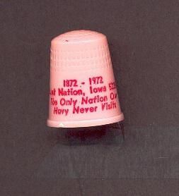 Pink plastic advertising thimble with raised rim. Wide plain band above with red lattering. Ò1872 -1972 Lost Nation, Iowa 52254 The Only Nation Our Navy Never VisitsÓ. U.S.A. 8 in apex.