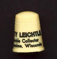 Cream coloured plastic Personal thimble with raised rim. Wide plain band above with black printing ÒBetty Leichtle Thimble Collector, Milwaukee, WisconsinÓ. U.S.A. 20 in apex.