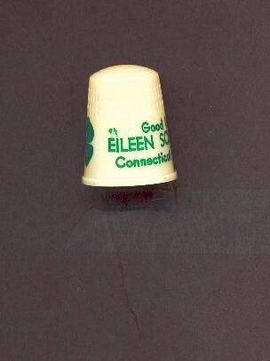 Plastic Personal thimble, cream coloured with green printing. Wide plain band above raised rim with ÒGood Luck Eileen Schwall Connecticut - 1978Ó Also a green four leafed clover. U.S.A. 17 in apex.