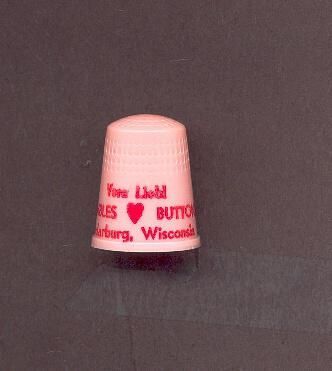 Pink plastic Personal thimble with raised rim. Wide plain band above rim with red printing ÒVera Liebl Thimbles Buttons Cedarburg, WisconsinÓ A red heart is between the words thimbles and buttons. U.S.A. 12 in apex.