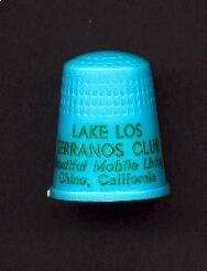 Blue plastic Advertising Thimble with raised rim. Wide plain band above rim with green printing advertising ÒLake Los Serranos Club Beautiful Mobile Living Chino CaliforniaÓ U.S.A. 20 in apex.