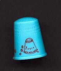Blue plastic Personal thimble with raised rim. Wide plain band above with maroon printing. ÒTCI Rules in 1980 Glad You Came Joyce Hughes-Stephens,Burbank, CaliforniaÓ. U.S.A. 19 in apex.