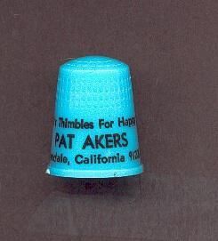 Plastic Personal thimble with raised rim. Wide plain band above with black printing ÒPatÕs Thimbles For Happy Pat Akers, Glendale, CaliforniaÓ Thimble is blue in colour. U.S.A. 12 in apex.