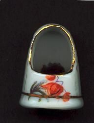 White porcelain finger guard with a slightly raised rim. Fine gold line at rim. and around open part. Japanese lantern flowers and leaves, orange and green spray just below open part. Knurling oin back. Paper label with ÒMade in JapanÓ on back