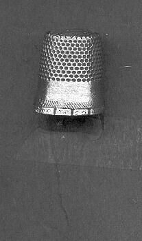 Pewter thimble with narrow raised rim. Rim is sectioned in small rectangles with design. Ridged row above rim then wide plain band. Knurling from here to top. Top has a plastic disc with picture of the Golden Gate with San Francisco around it. Inside apex is Walt Disney Productions.