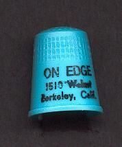 Blue plastic advertising thimble with raised rim. Wide plain band above with dark blue printing advertising ÒOn Edge 1510 Walnut Berkeley, Calif.Ó U.S.A. 9 in apex.