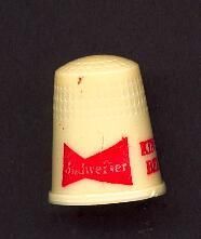 Cream coloured plastic advertising thimble with raised rim. Wide plain band above with red printing. Logo of beer glass on side with Budweiser on it in red and a, printed ÒKing of BeersÓ also in red print. U.S.A. 9 in apex.