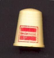 Cream coloured plastic advertising thimble with raised rim. Wide plain band above with red printing - logo for ÒBank AmerigardÓU.S.A. 5 in apex.
