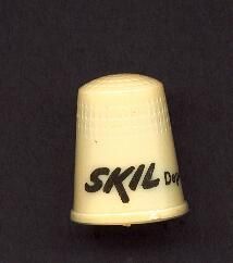 Cream coloured plastic advertising thimble with raised rim. Wide plain band above with black printing advertising ÒSkil DependililityÓ U.S.A. 16 in apex.